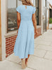Ta odważna i przewiewna sukienka midi ma pochlebny elastyczny top z marszczeniami, ma okrągły dekolt, jednolity kolor, wysoką talię, krótkie rękawy, obszyte zabawnymi falbankami na ramionach, zapięcie na dziurkę od klucza z tyłu i zwiewną, wiązaną spódnicę midi, która dodaje więcej kobiecości.