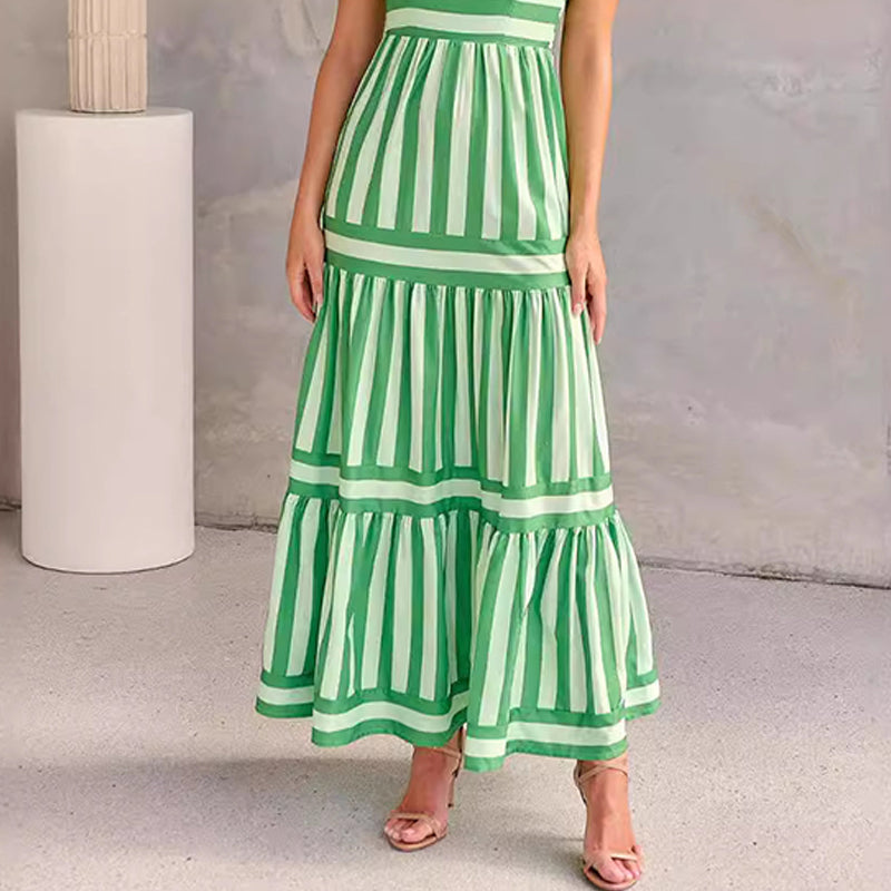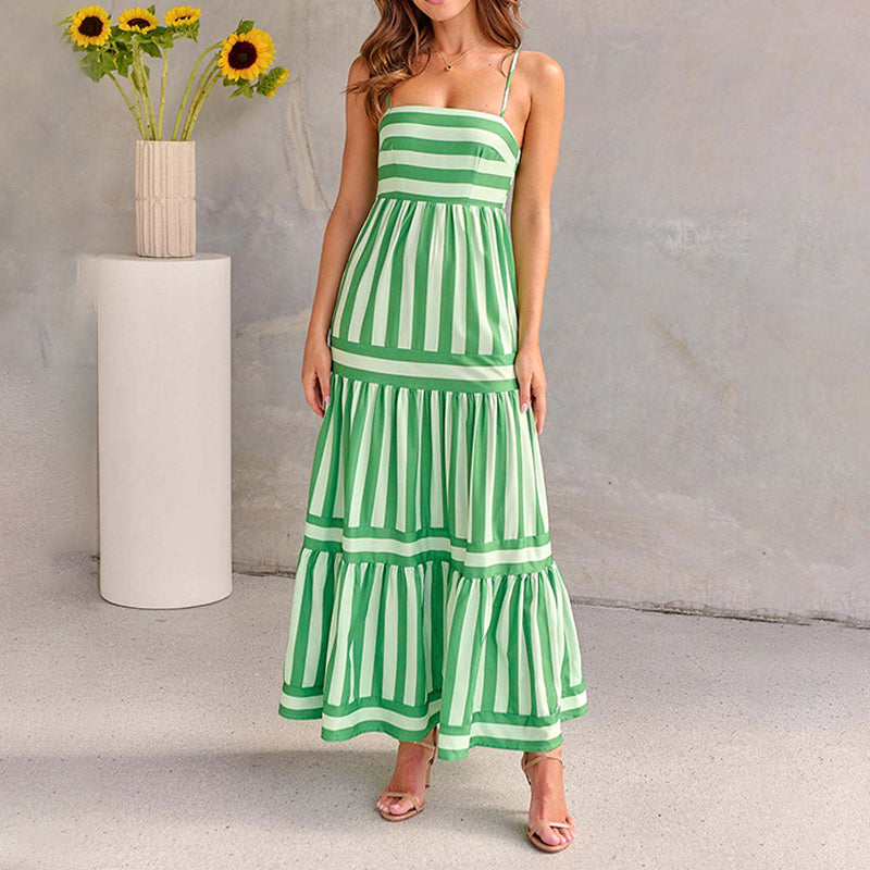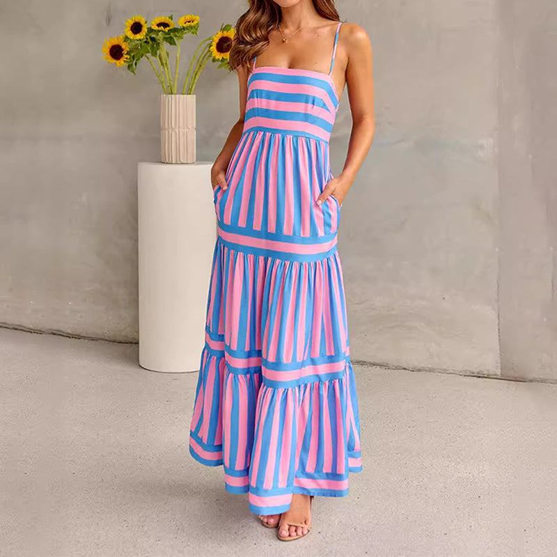 W skład zestawu wchodzi: 1× Sukienka maxi w paski z kolorowym blokiem i wąskimi ramiączkami