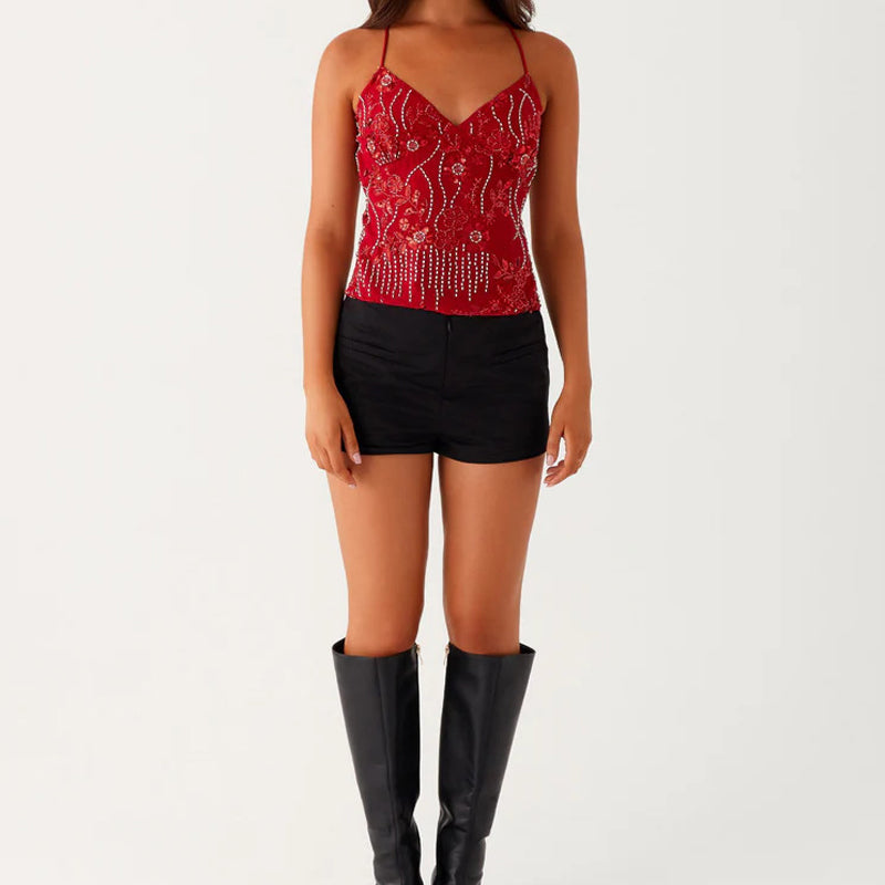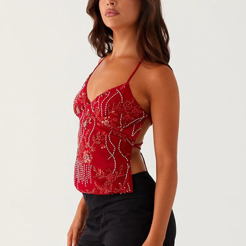 🔥🩱Seksowna haftowana cekinowa krótka koszulka na ramiączkach