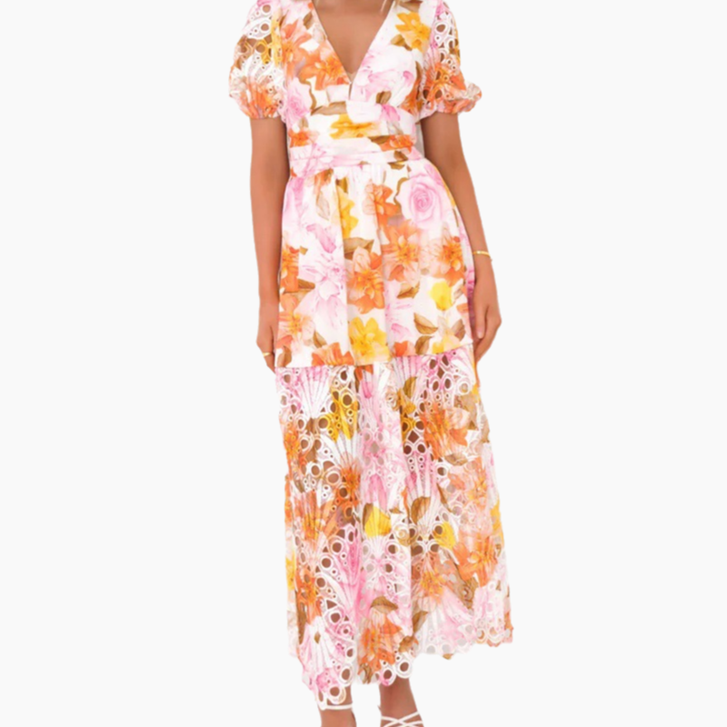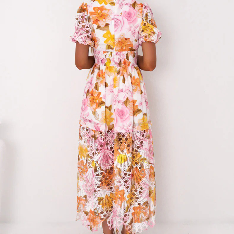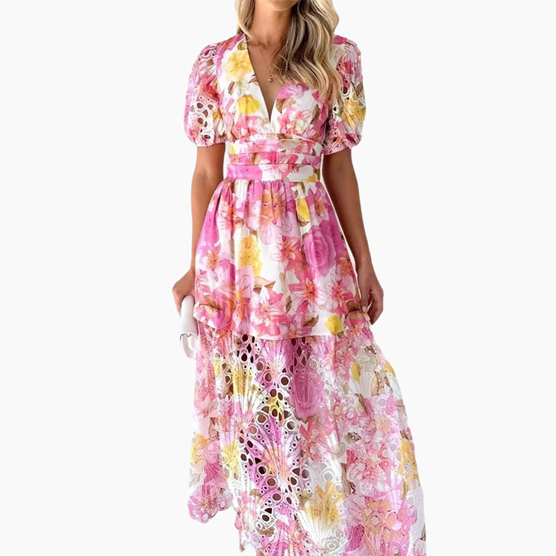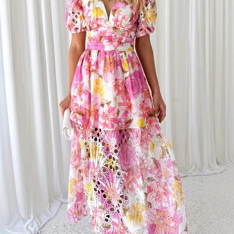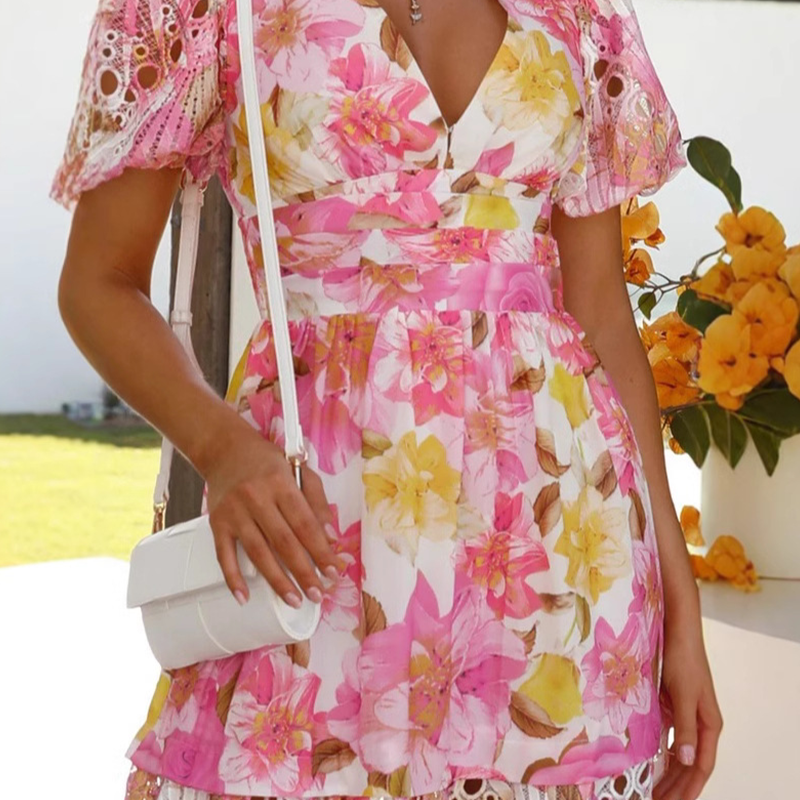 Opakowanie zawiera 1 * damską sukienkę z dekoltem w szpic z nadrukiem w żywych kolorach