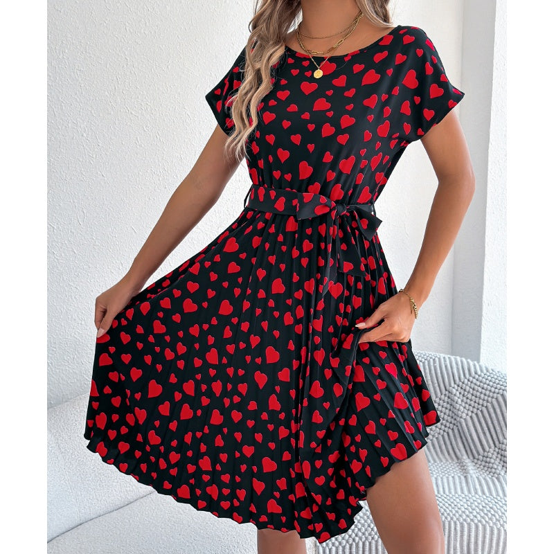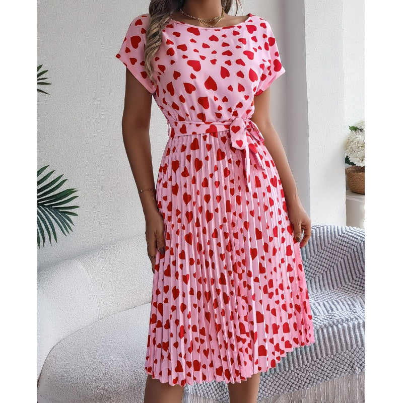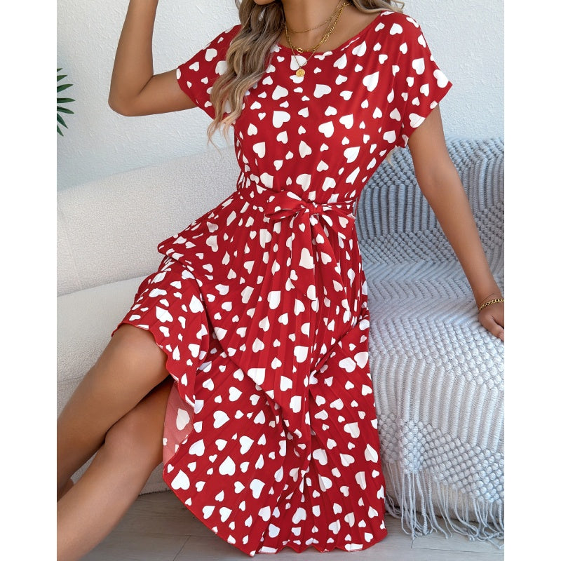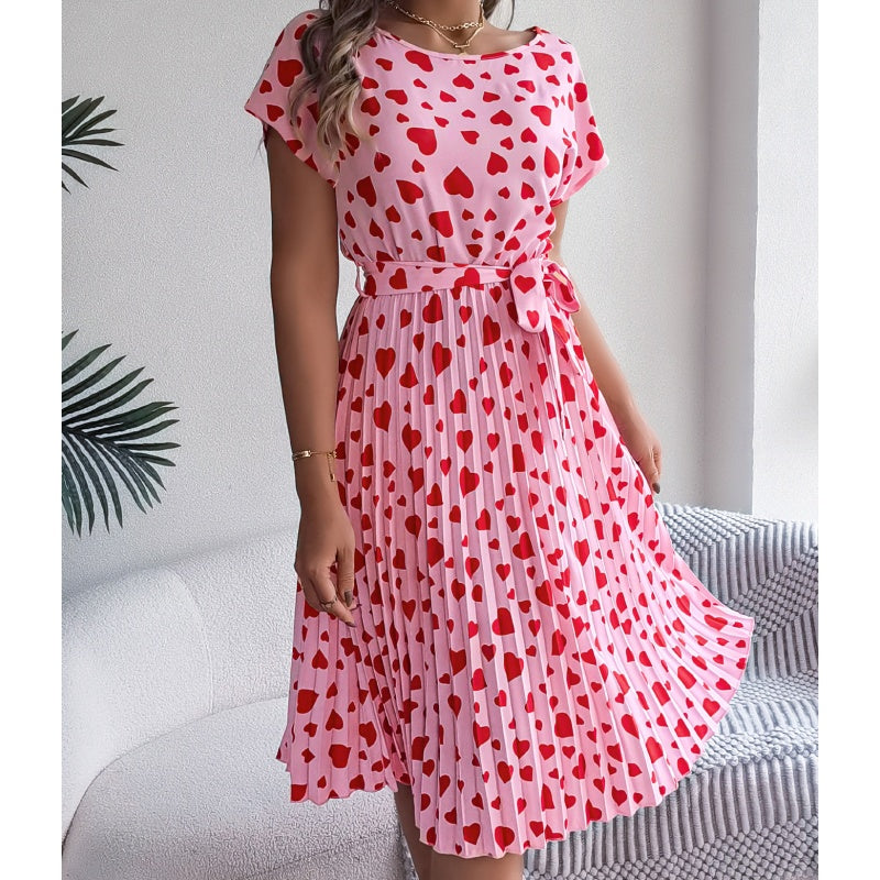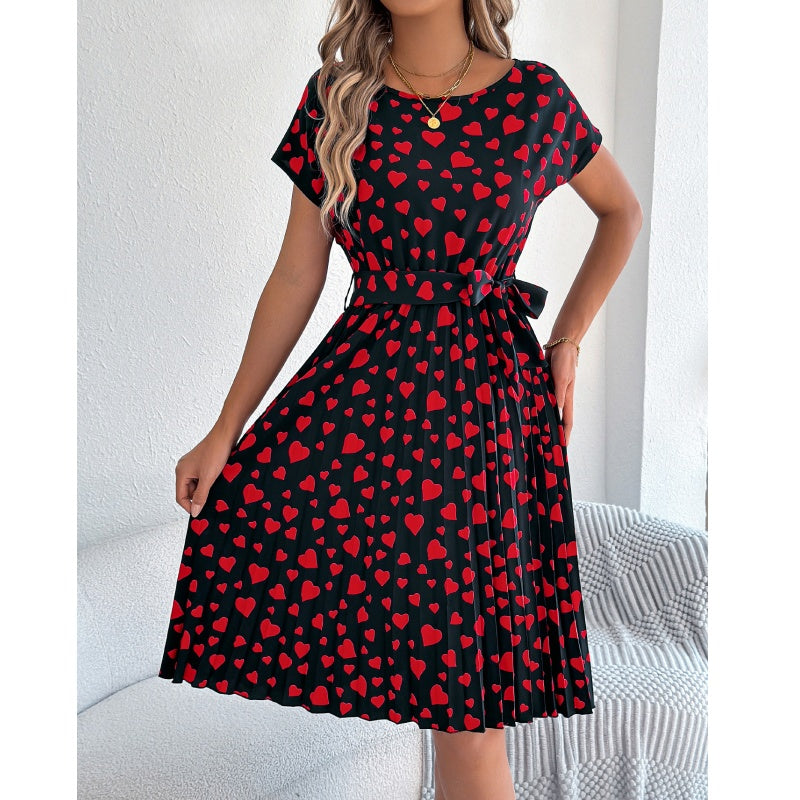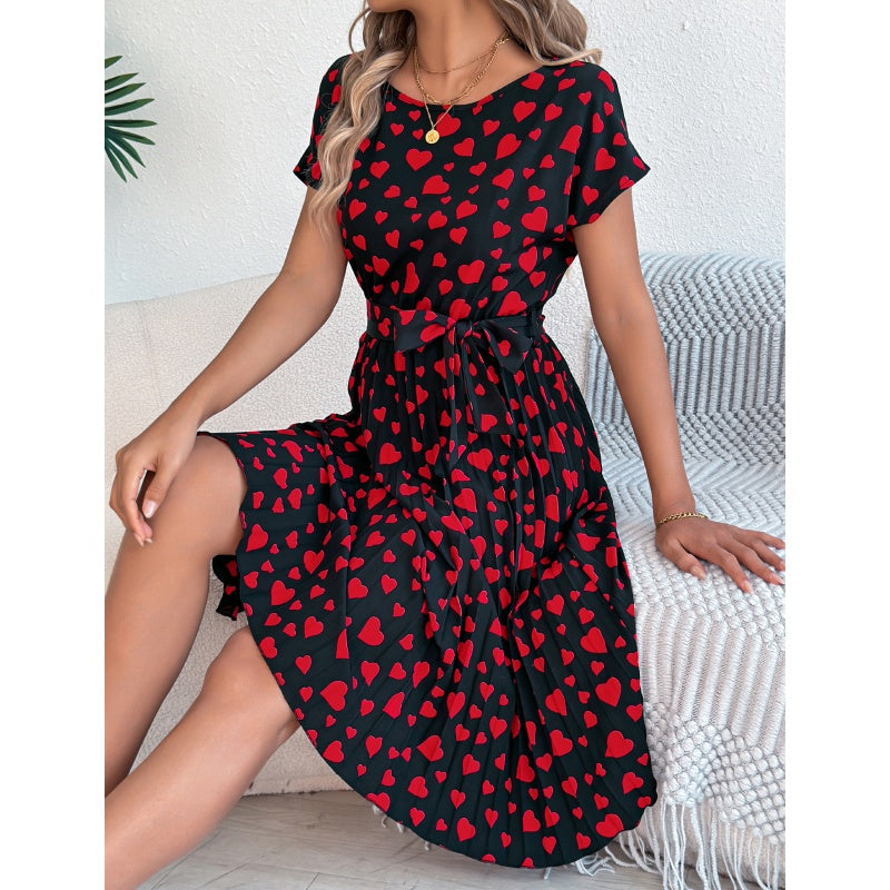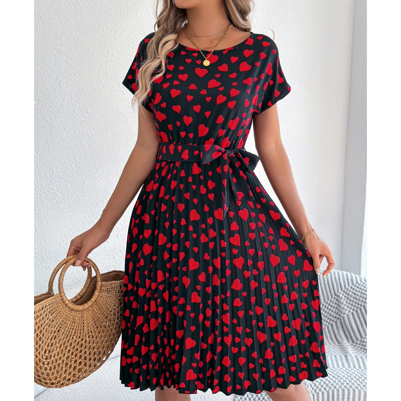 🔥👗 Sukienka z okrągłym dekoltem i krótkim rękawem w serduszko z pasującym paskiem