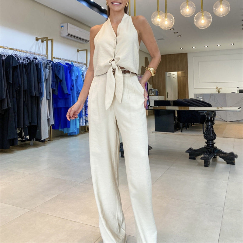 Elegancki dwuczęściowy, dopasowany projekt: Ten elegancki zestaw składa się z bezrękawnika typu halter oraz spodni z wysokim stanem i szerokimi nogawkami. Zestaw jest uniwersalny i stylowy — możesz go nosić razem, aby uzyskać elegancki wygląd, lub oddzielnie, aby stworzyć nowe stylizacje.