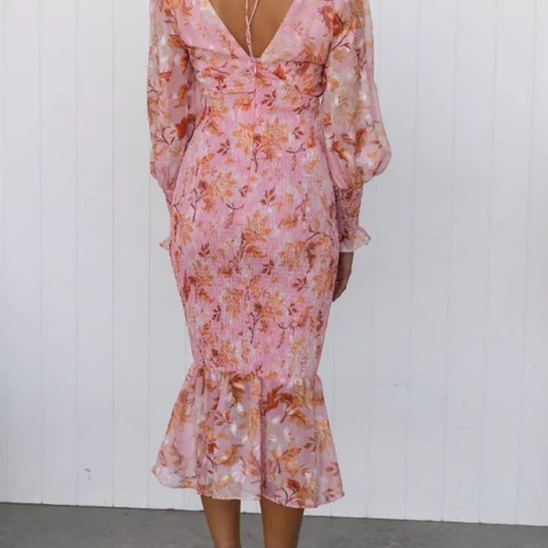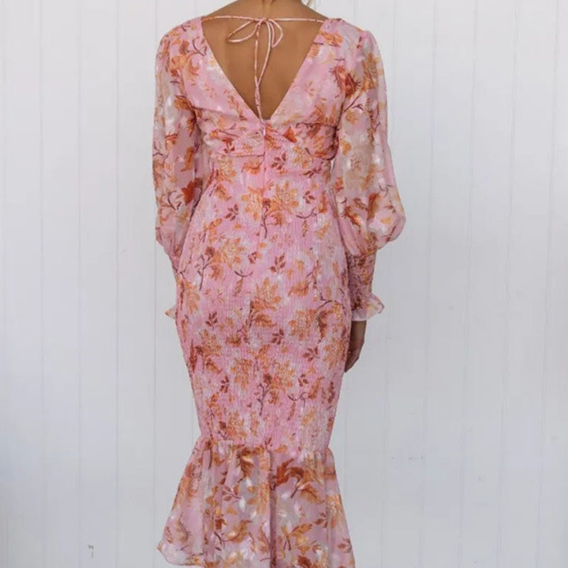 Zawartość opakowania: 1*Eleganckie damskie sukienki z długim rękawem i dekoltem w serek z nadrukiem i falbanką