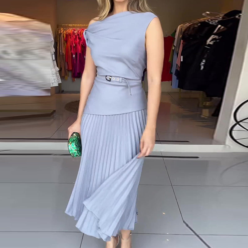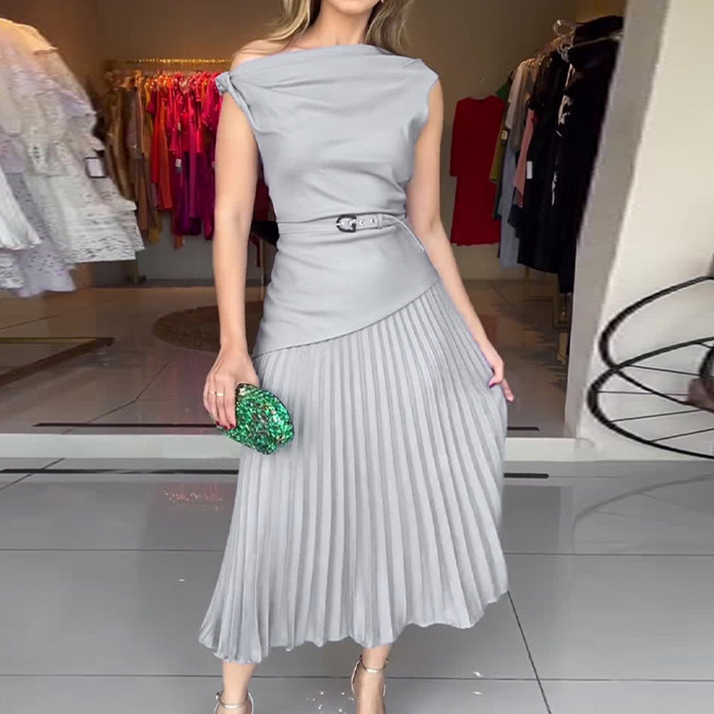 🔥👗Damska plisowana sukienka z odkrytymi ramionami i paskiem