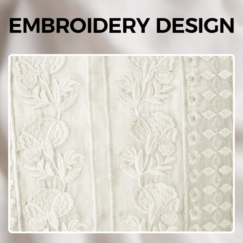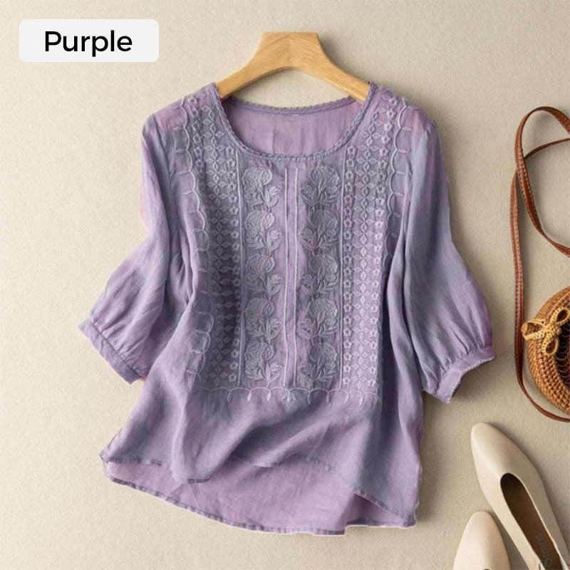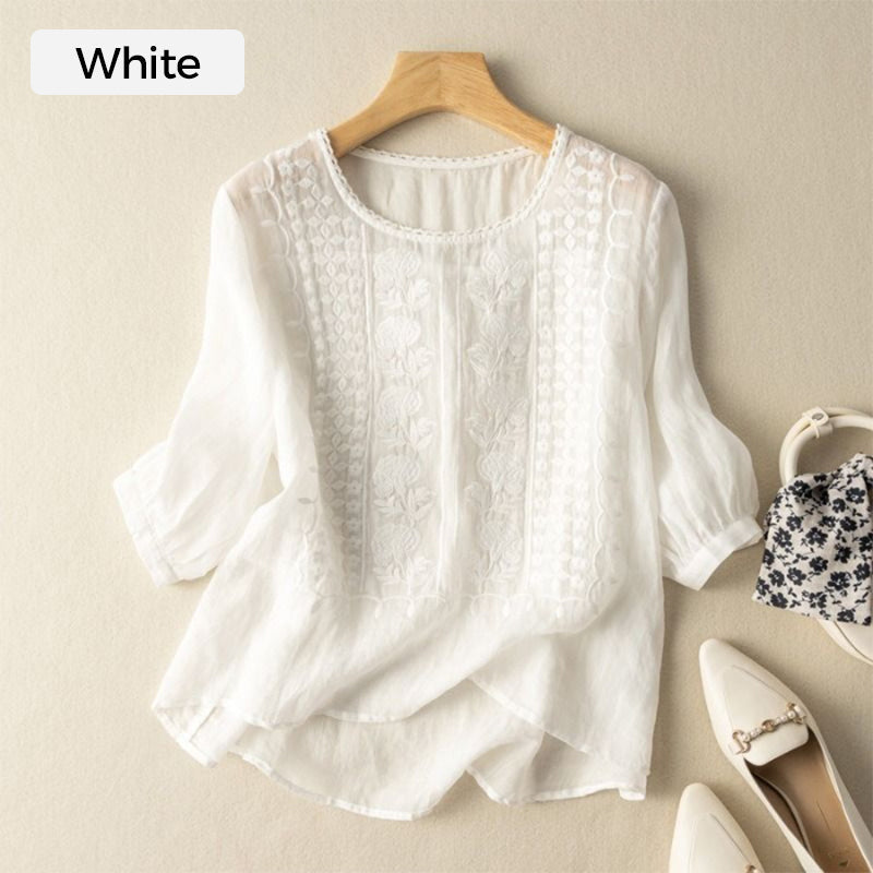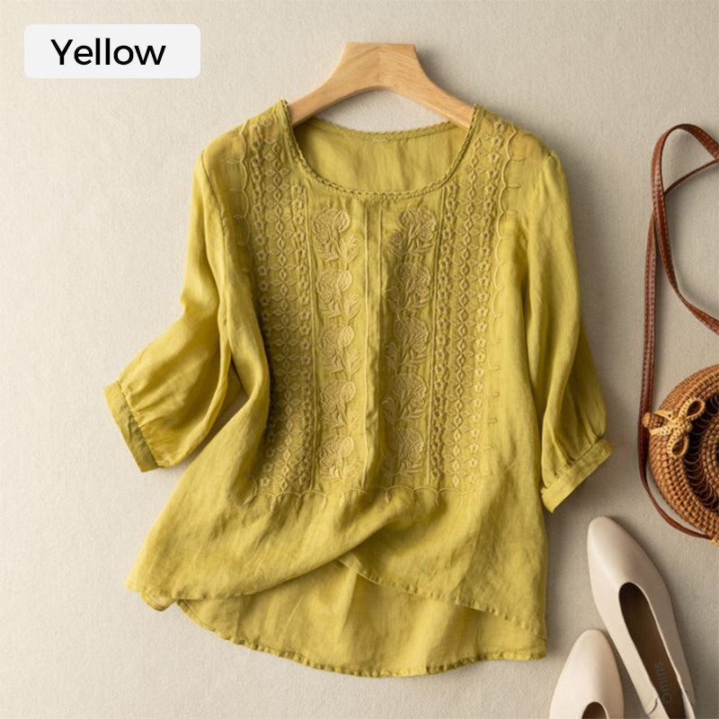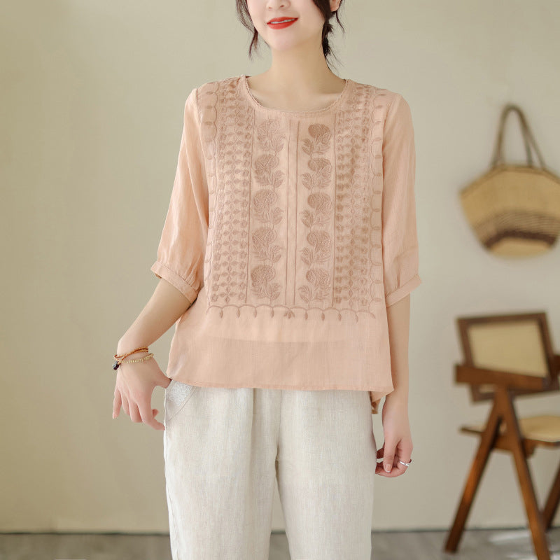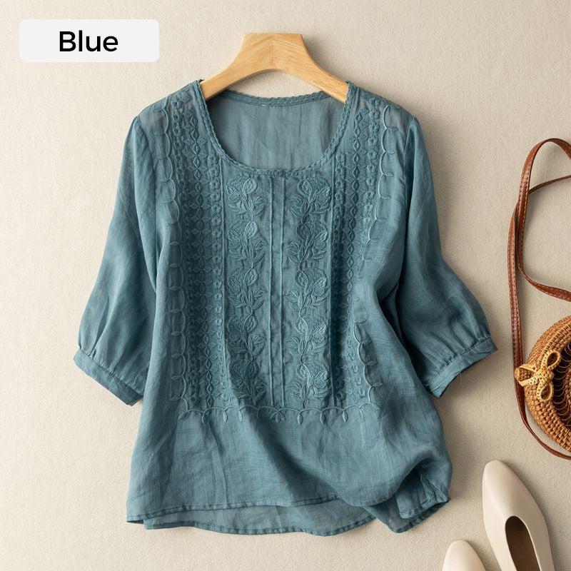 1 x Damska cienka, haftowana, oddychająca, bawełniana, lniana koszula z krótkim rękawem i okrągłym dekoltem